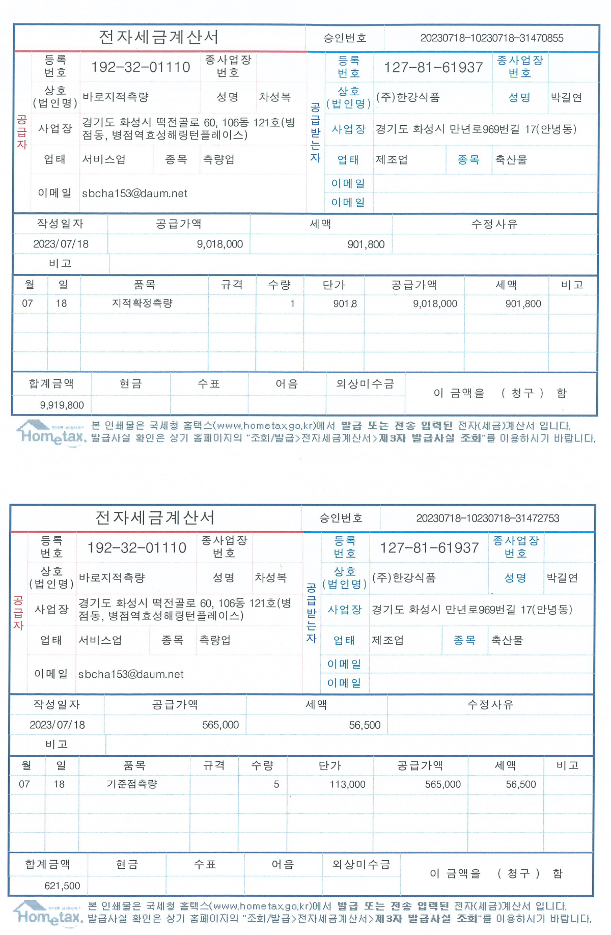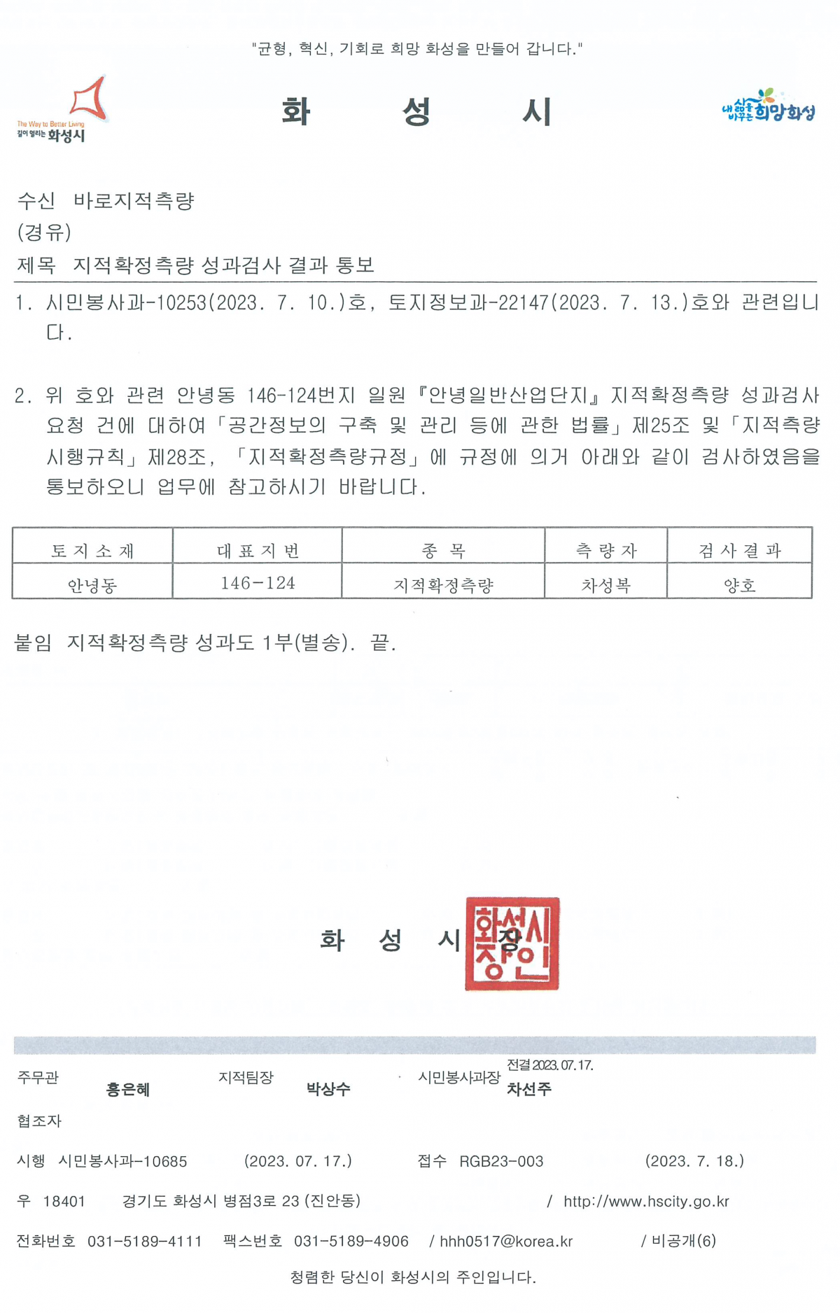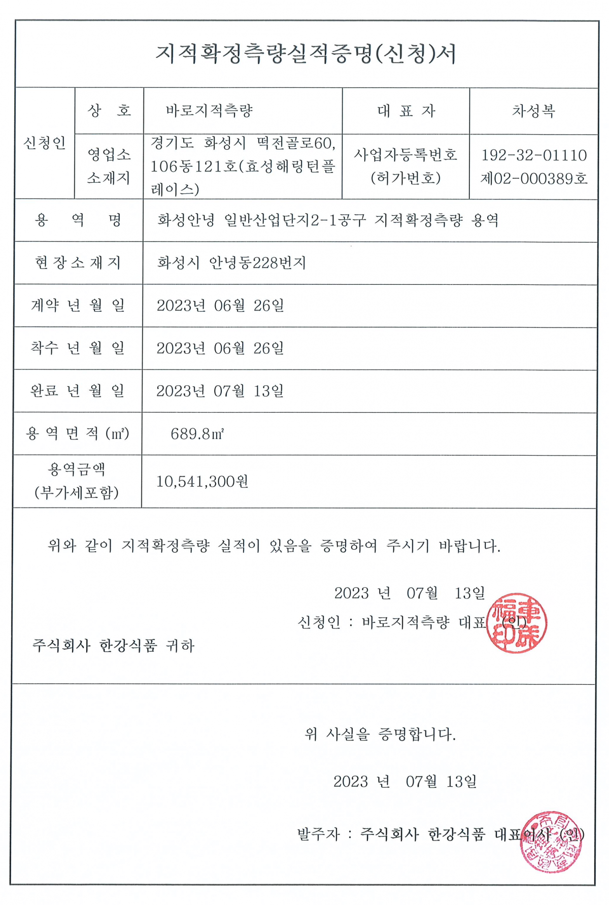 주식회사 한강식품 안녕동 지적확정측량 완료(23.06.26~07.13)