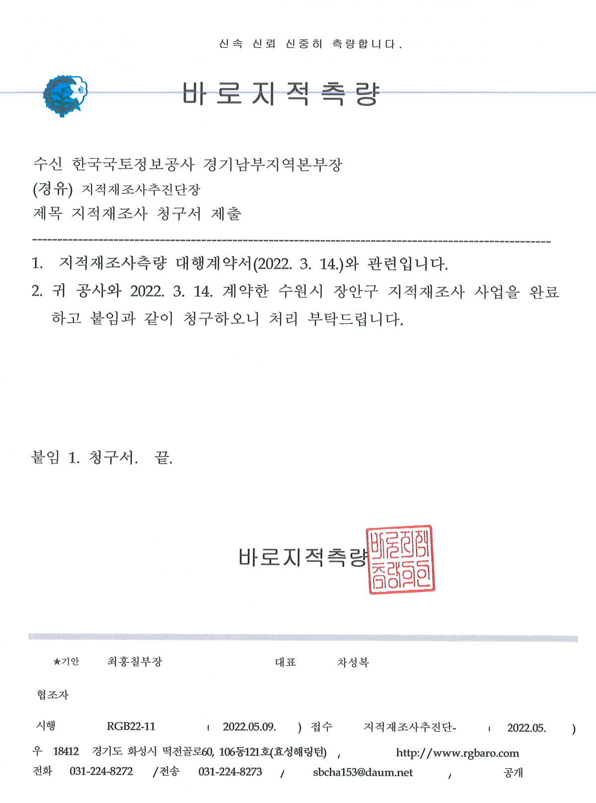 수원시장안구 지적재조사사업 업무 완료(22.03.14~ 22.04.28)